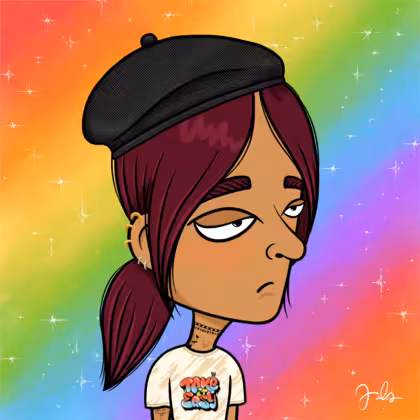 Collection Depressed Citizens Artist Juls Description ART. No team, no project, no future. Depressed Citizens is an urban & existential Art expression on Ordinals. In a parallel universe, "THEI" control us. DC unites against toxic society, encouraging critical thinking. 100% hand made collection that took Juls more than 6 months of daily work. Name Citizen#3071 Origin LGBT-Q+ Gender Non-binary Necklace Choker Hat Black beret Mustache Beard No beard Glasses No Glasses Earrings Upper lobe rings Hair Style Low ponytail Clothes Take it easy oversized T-shirt Tattoo Rose tattoo Star Background With stars